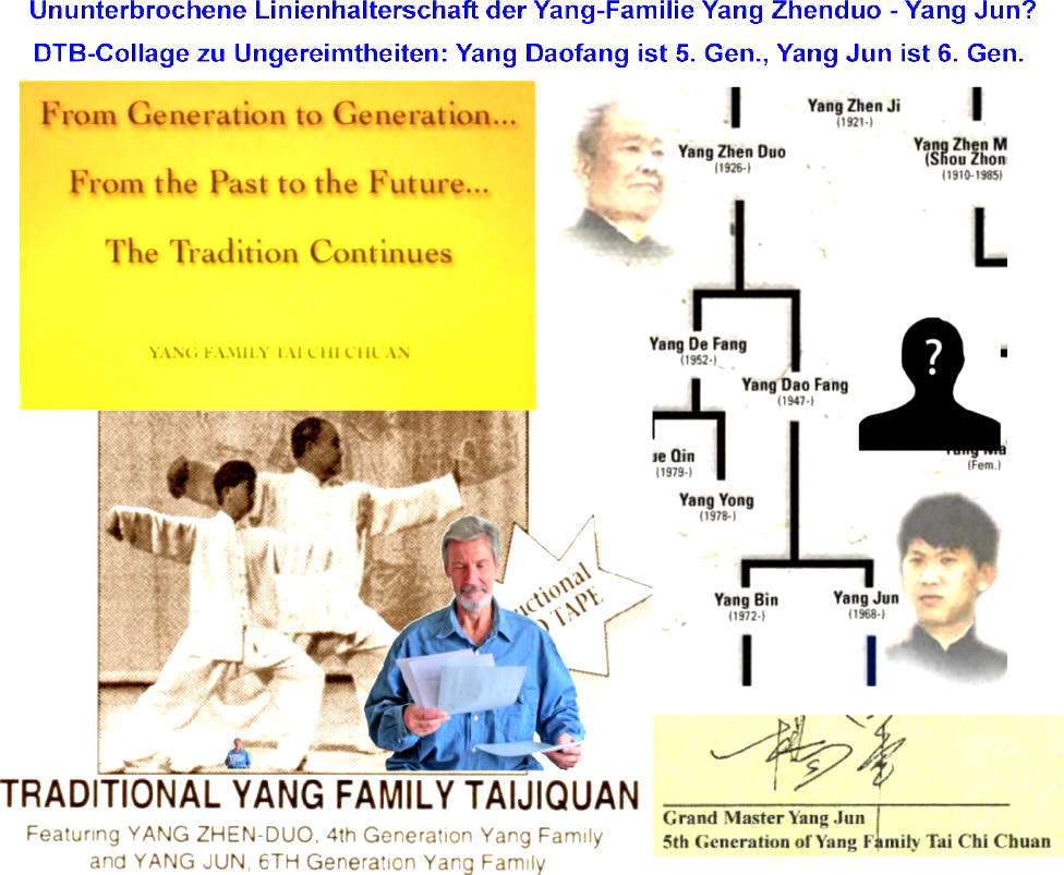 Yang Jun hat erst kürzlich das "Yang-Daofang-Tabu" offiziell gelüftet: Sein Vater fiel aufgrund politischer Ereignisse als Überlieferer "von Generation zu Generation" aus. Damit sagte er Insidern nichts neues - denn diese wußten längst bescheid. Aber es fällt auf, daß er damit Aussagen der Homepage Yangfamilytaichi.com, die wohl von seinem Großvater stammen, klar widerspricht.